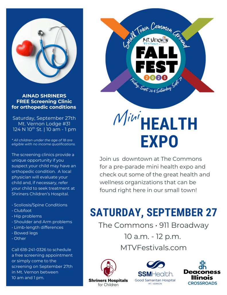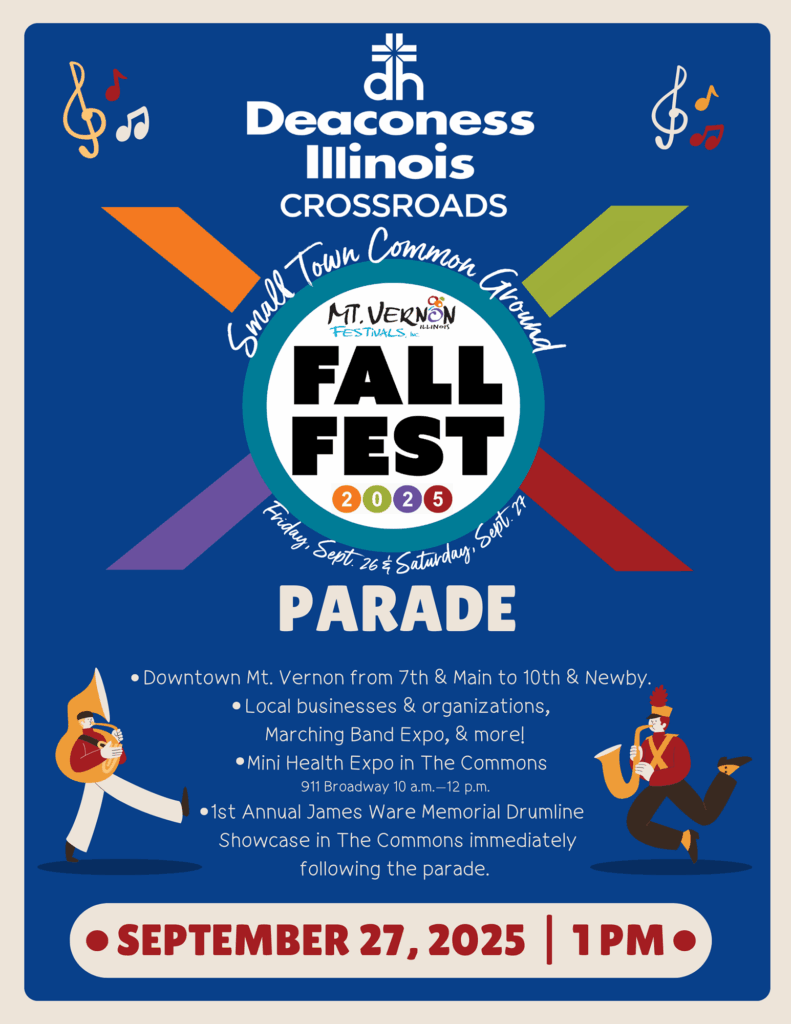 Join us in the heart of Mt. Vernon, Illinois, for the 2025 Deaconess Illinois Crossroads Parade – a highlight of Mt. Vernon Fall Fest! This year’s theme, “Small Town, Common Ground,” celebrates the shared values, connections, and community spirit that unite our town and surrounding areas. The parade invites regional organizations, schools, businesses, and families to creatively showcase what “common ground” means to them – from hometown pride and heritage to collaboration and unity.