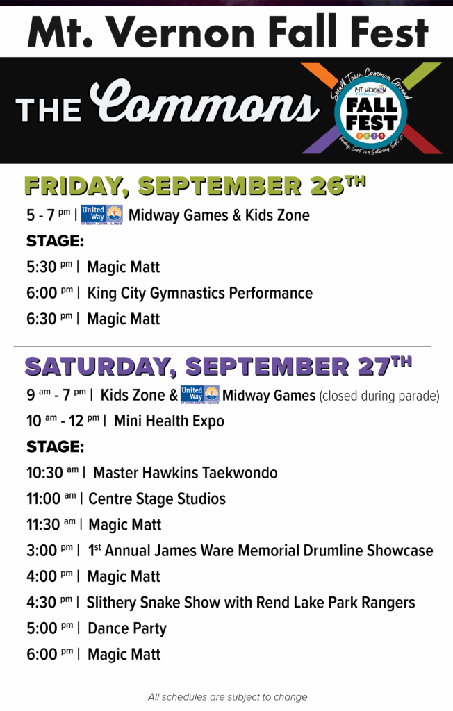 Mark your calendars for September 26th & 27th and join us downtown for a weekend filled with music, laughter, great food, and unforgettable memories at Mt. Vernon Fall Fest. It’s a celebration of community spirit and a true showcase of everything we love about our vibrant city. We look forward to seeing you there!